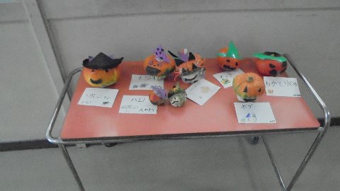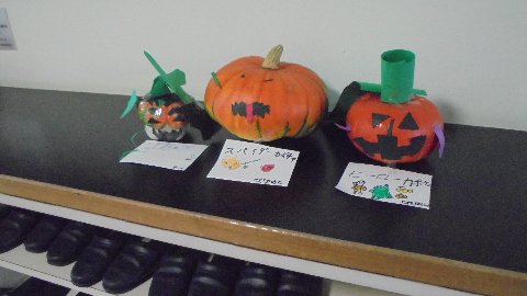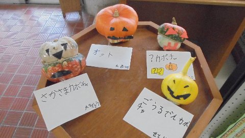 学校のいろんな場所にカボチャが飾られています。ハロウィーンの飾りです。作って飾ってくれたのは2年生です。ありがとう、上手に作られています。それぞれの作品に名前が付けられています。聞いてみて下さいね。