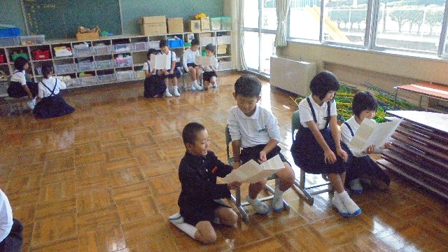 3年生が国語で学習した物語についてまとめたものを2年生に紹介しています。分かりやすく説明することも勉強、来年学習することをきちんと聞くのも学習。うまくかみ合っていますね。