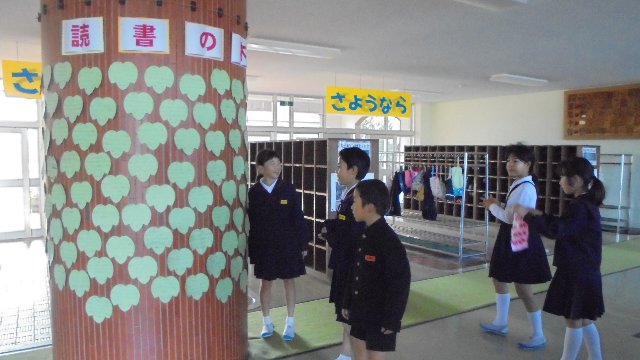 児童玄関に太い太いブドウの木が現れました。葉っぱがいっぱいついていて、一枚一枚に全校児童が読んだ本の感想が書かれています。読書の木です。