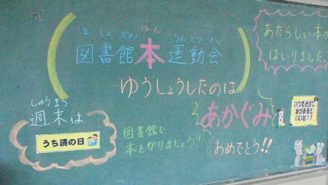 いま子どもたちが頑張って取り組んでいる運動会の話を読みました。『はしれ、ゴールのむこうまで!』はかけっこが苦手な1年生のそうた君と校長先生のお話です。読んでいる途中に「がんばれ!」という本物の校長先生の声が。絶妙なタイミングにみんなビックリ!! 楽しい読み聞かせになりました。