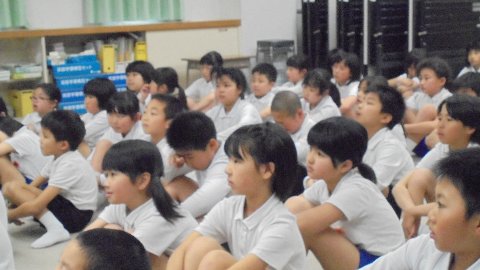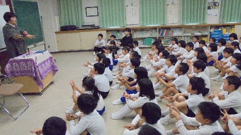 *清水さん、松本敦子さんのお2二人の手遊びや絵本、お話などを楽しみました。中学年の みんなは素直な反応を見せてくれるので、やまんばさんのお二人も「楽しかったね」と言って帰られました。後期図書委員の2人が司会をしましたが、とても上手にできました。