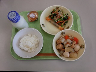 給食の時間に、学校司書がメニューに使われた本の紹介と