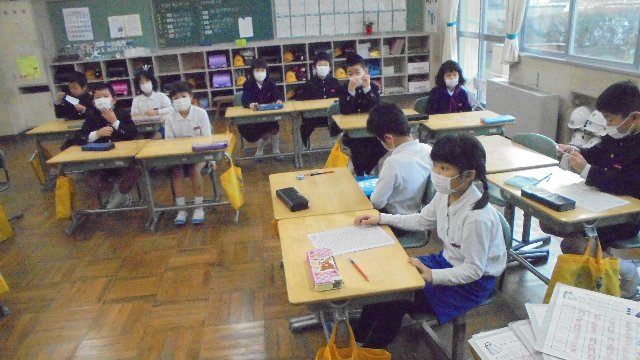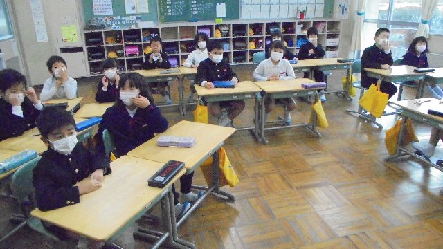 低学年はそろってマスク着用です。マスクするとどんないいことがあるかたずねると、くちびるが乾かないという意見もありました。インフルエンザウィルスは乾燥が大好き、そういった意味からも効き目がありそうですね。お家でもすると良いね。