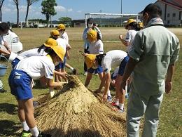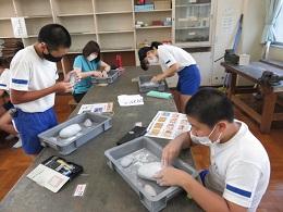 6年生は、かほく市スポーツ文化課の方に教えていただきながら、制作した土器を藁を重ねて粘土を塗った窯で野焼きにしました。県埋蔵文化センターの先生からも、縄文時代の土器の作り方や石のナイフ、勾玉づくりを教えていただきました。すべすべに磨いて作った勾玉のペンダントを嬉しそうに首にかけていました。また、学習に向かう態度が良いとほめていただき、これも子どもたちにとっては、自信につながる大きな経験になりました。