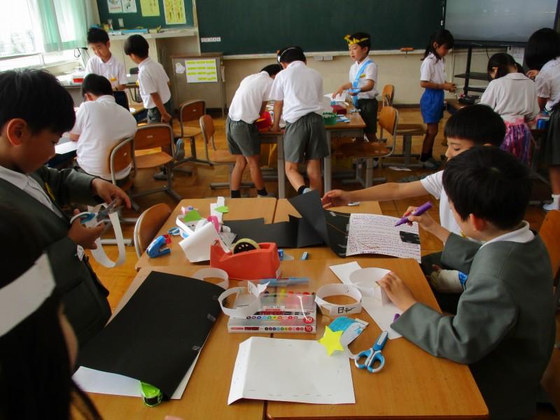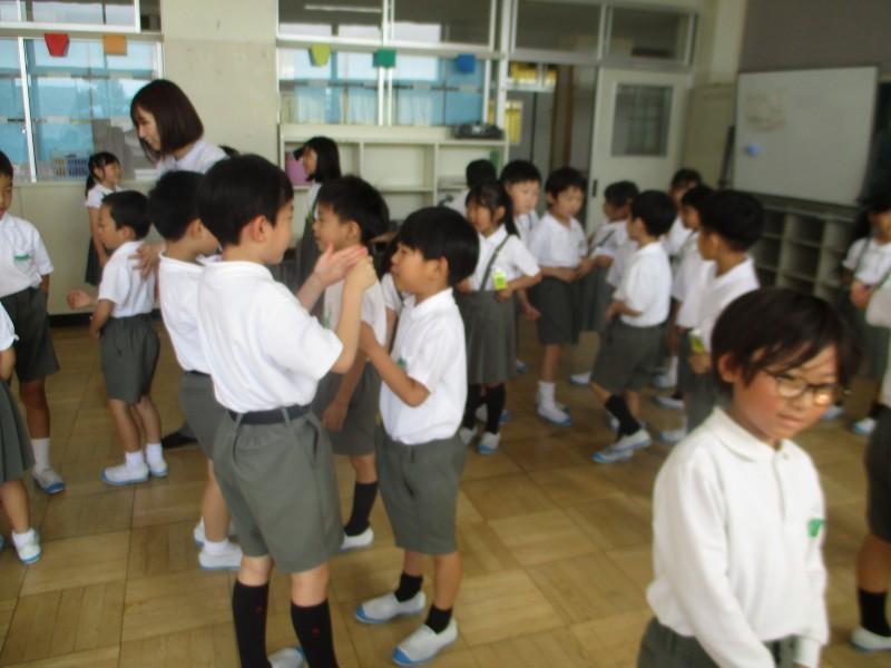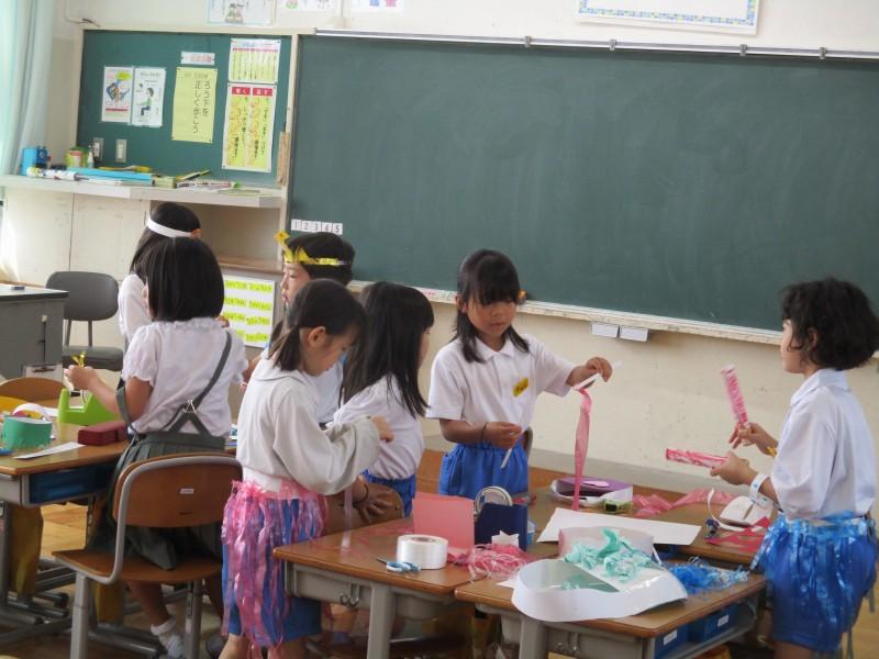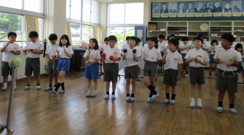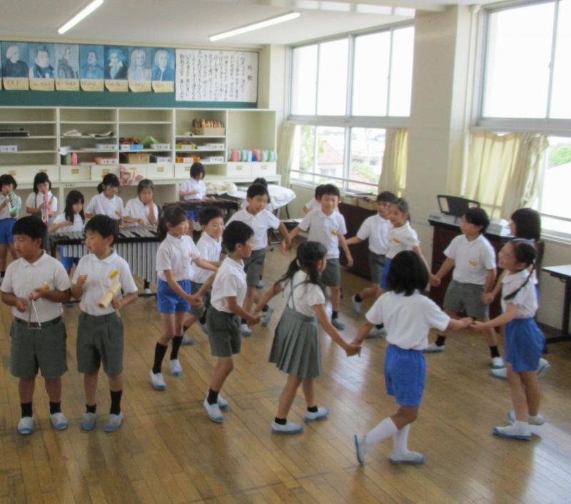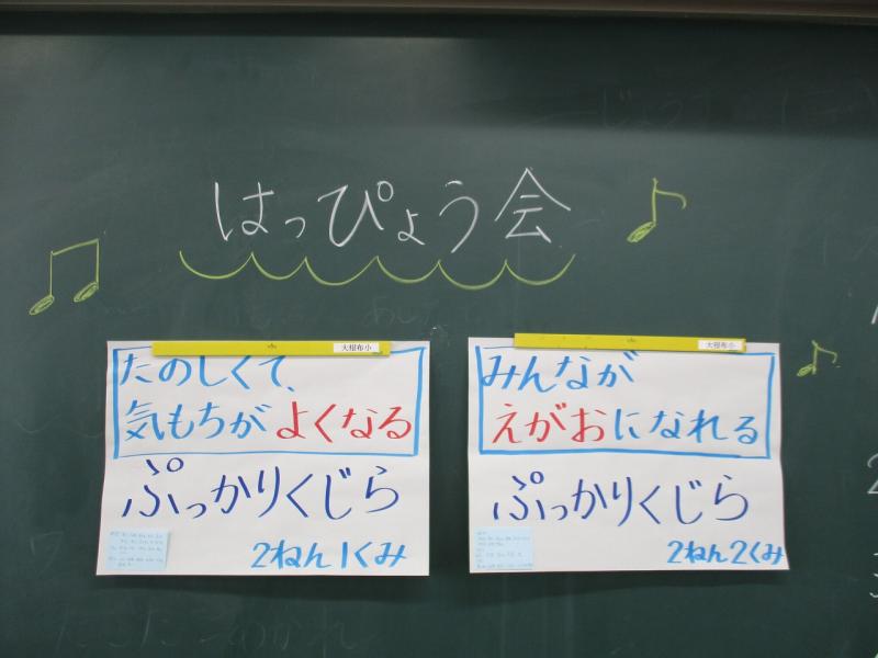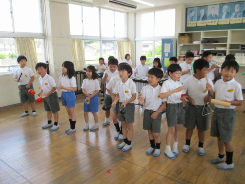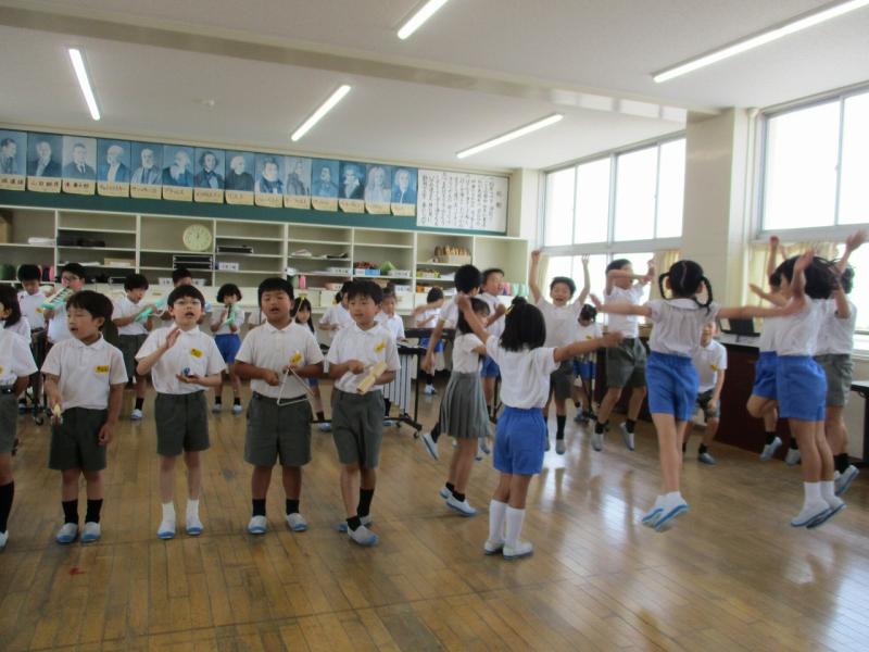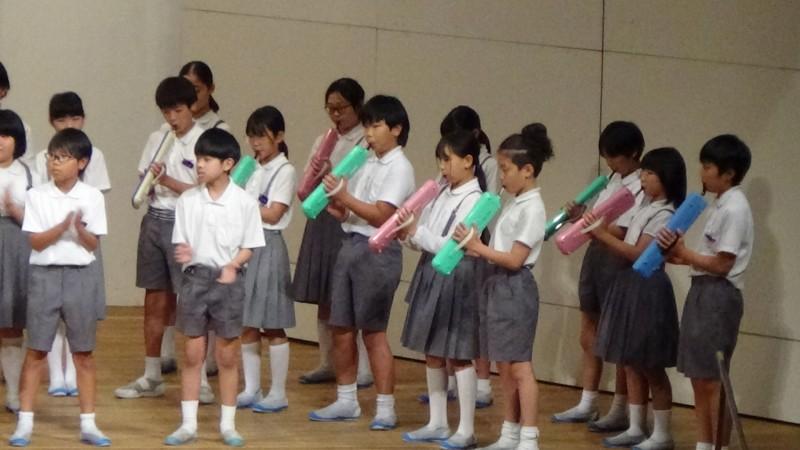 それぞれのクラスの成果をお互いに見合いました。その後、2クラス一緒に「ぷっかりくじら」を演奏しました。