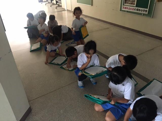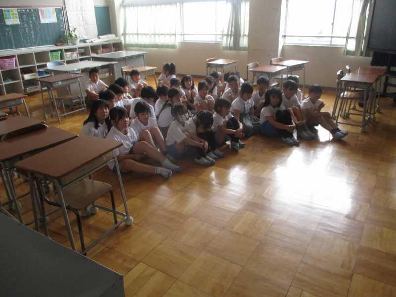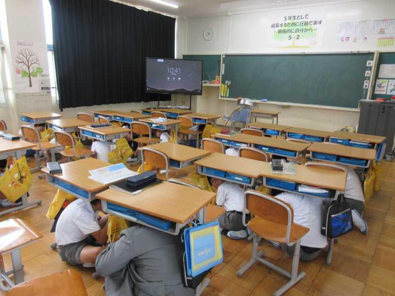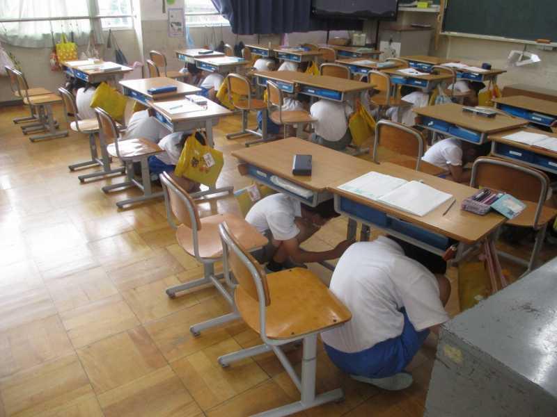 本日シェイクアウトいしかわとして避難訓練を実施いたしました。今回の内容は「地震が発生したのちに、津波警報が発令される」というものでした。教室で机の下に素早く隠れ、身を守るという避難行動をどの児童も落ち着いて行っていました。その後の3階への避難も静かに素早く行うことができました。