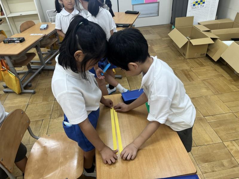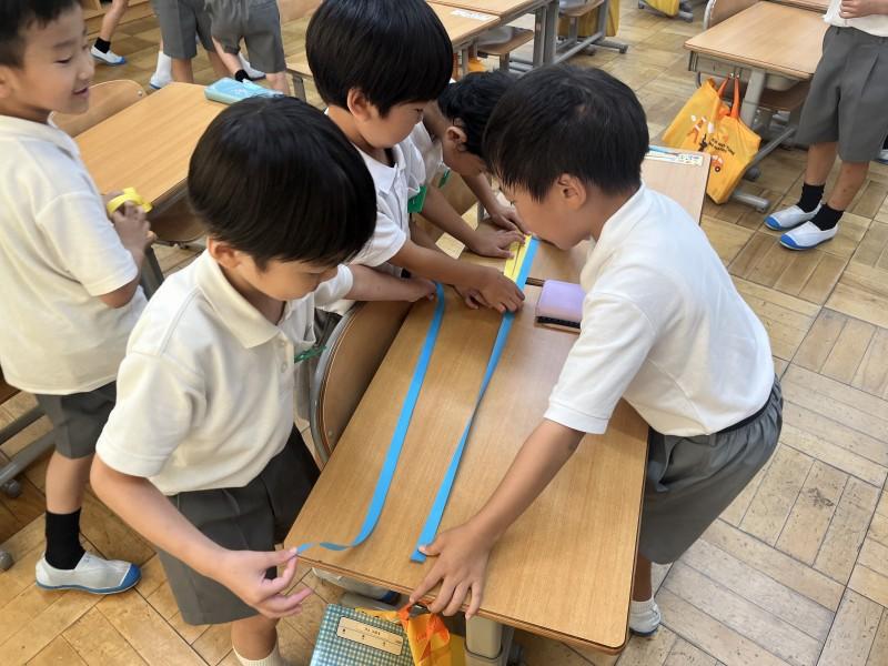 長さくらべの学習を行っています。実際に、テープや鉛筆の長さも比べてみました。