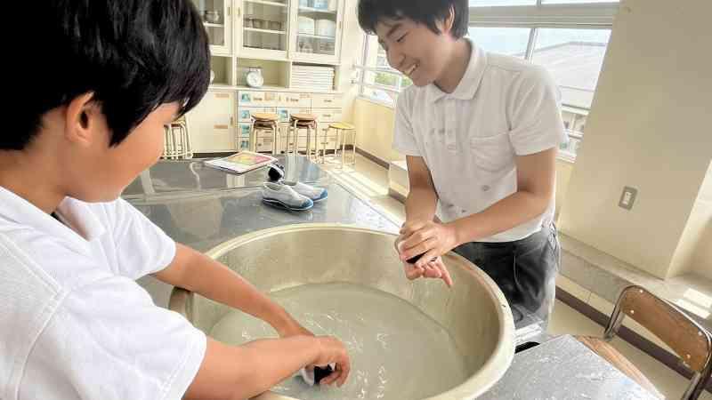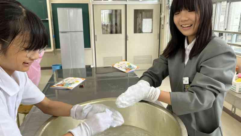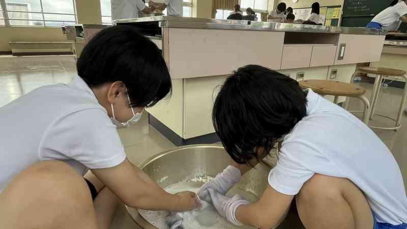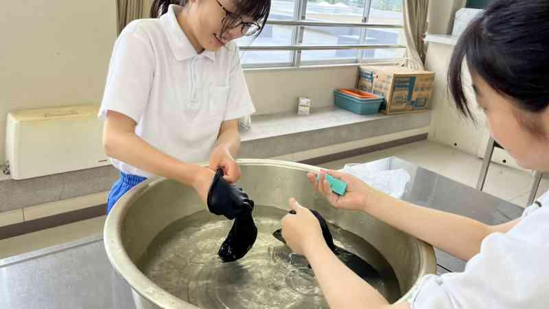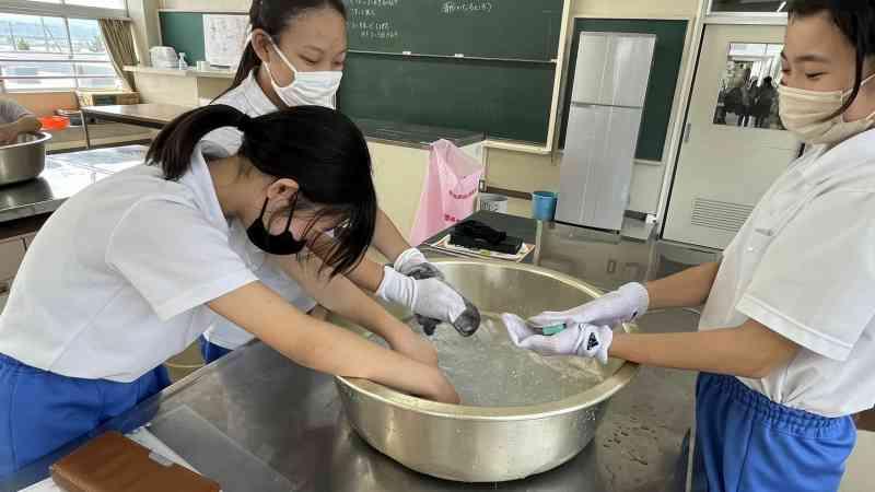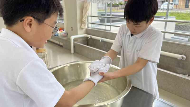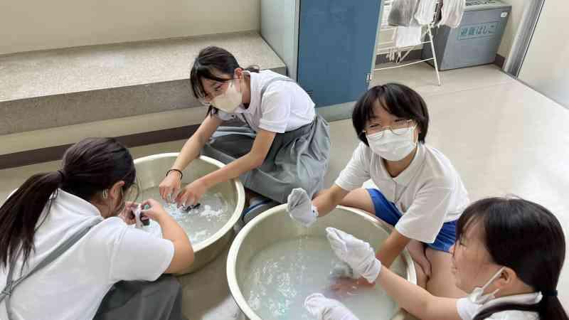 6年生は、家庭科の学習で「くつ下の手洗い」をしました。