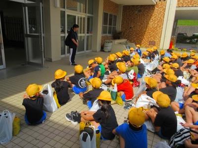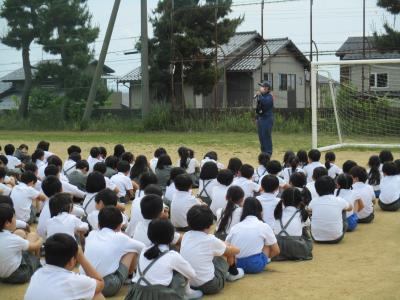 運動場へ避難し、内灘町消防本部の方のお話を聞きました。マスクをしていてもハンカチや手でしっかり口をおさえることが大切だと学びました。