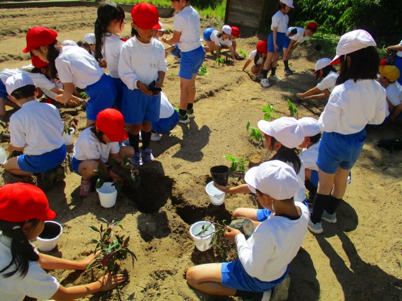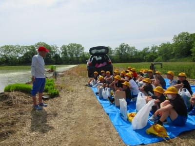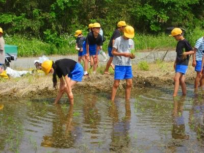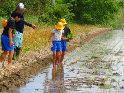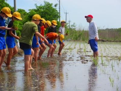 本日、川辺俊一様にご協力をいただき、田植え体験を行いました。子どもたちは初めての田んぼに苗を植えるという体験に、最初は難しさや素足で田んぼに入ることに抵抗感を感じていた子もいましたが、声を掛け合いながら活動に取り組み、最後は笑顔で体験を終えていました。体験を通して、田植えの大変さや難しさを実感しているようでした。