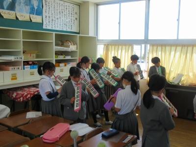 実行委員を中心として、自分たちで練習を進めていっています。初めは音楽室でどんな風に歌うのか、演奏するのかを確認していました。互いに見合い、教え合いながら覚えていく姿がみられました。