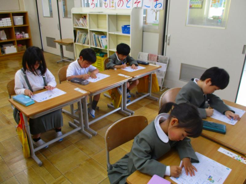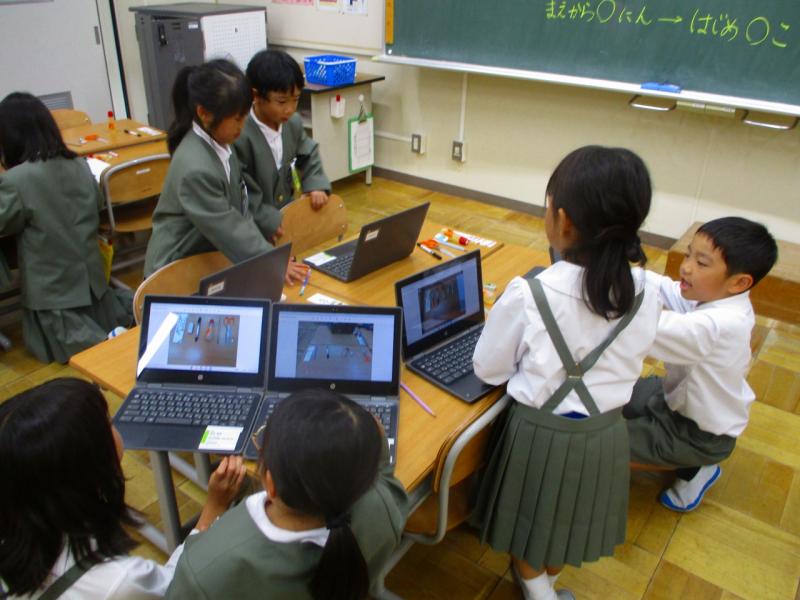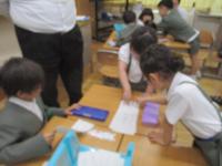 絵本を見たり、ショート動画を見たり、絵を見たり、おたすけカードを使ったり、自分で考えたりとそれぞれ自分で選んでたくさんの言葉を見つけ、文づくりをがんばっていました。そのあと、グループごとにできた文を読みながら、句読点がぬけていたり、文字が間違っていたりしたものを修正しました。最後には、がんばっていた友達を見つけて「すてきだったよ」と伝え合う姿がたくさんあり、見ている先生たちも思わず笑顔になっていました。