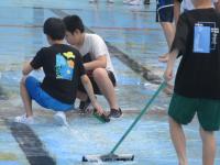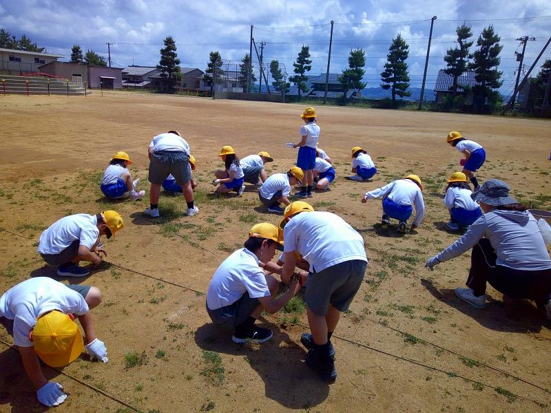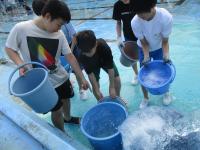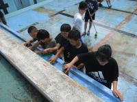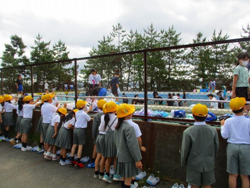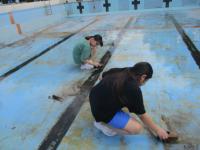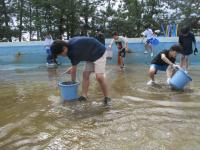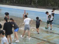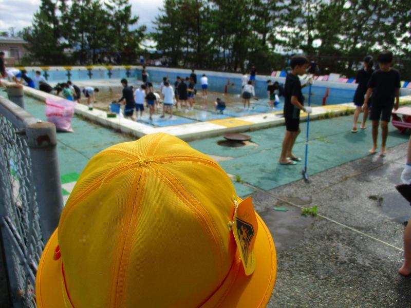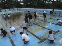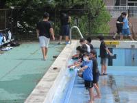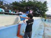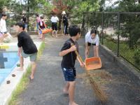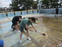 5年生は、更衣室やトイレ掃除加え、草むしりや松葉拾い、プールの周りの壁をこするなどたくさんの仕事を見つけて動いていました。6年生は、どろ水だったプールの中でしたが、バケツ隊とブラシ隊で協力してみるみるきれいにしてくれました。