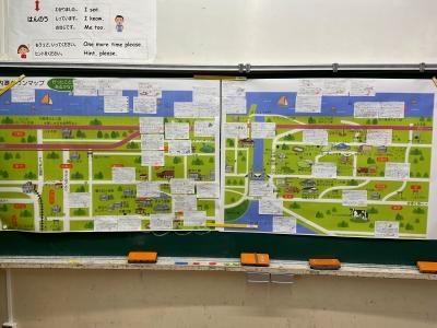 3学期の総合では今まで学習してきた内灘町のことを踏まえて、これから自分たちがどんな内灘町を作っていきたいかを考えていました。今回は、自分で考えた未来の内灘町の施設やその場所を交流し合い、未来の内灘マップを完成させました。