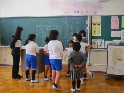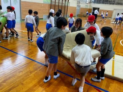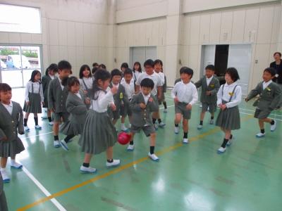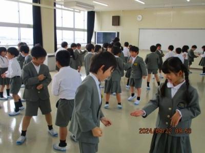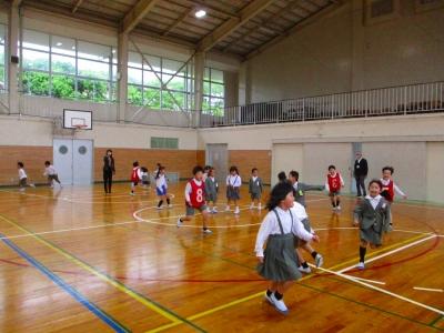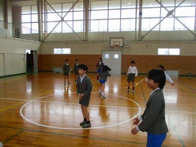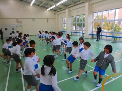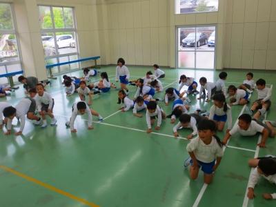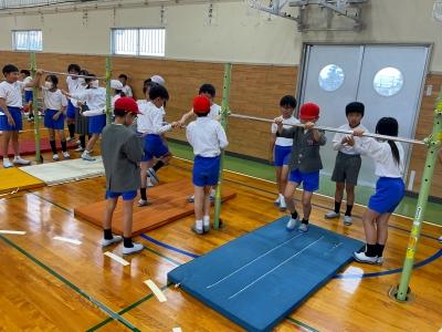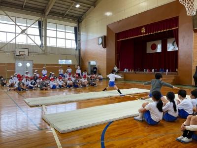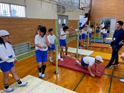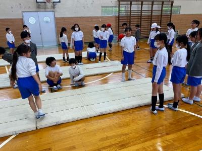 今日は、昨年度器械運動交歓会を経験している5年生が4年生と一緒に練習してくれて、お手本を見せたり、ポイントを説明したりしてくれました。