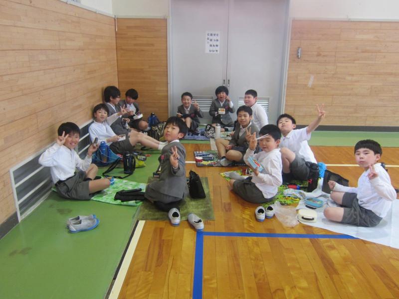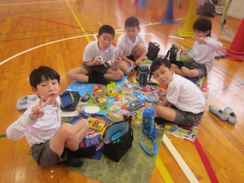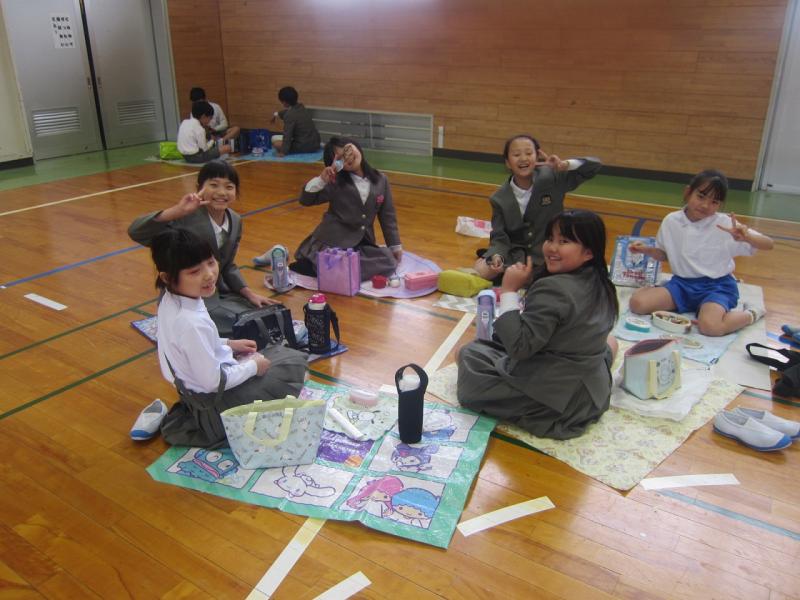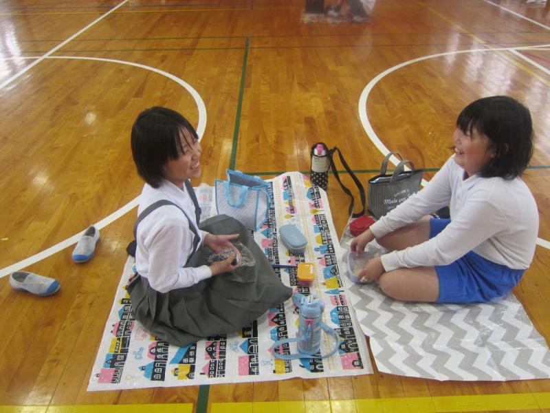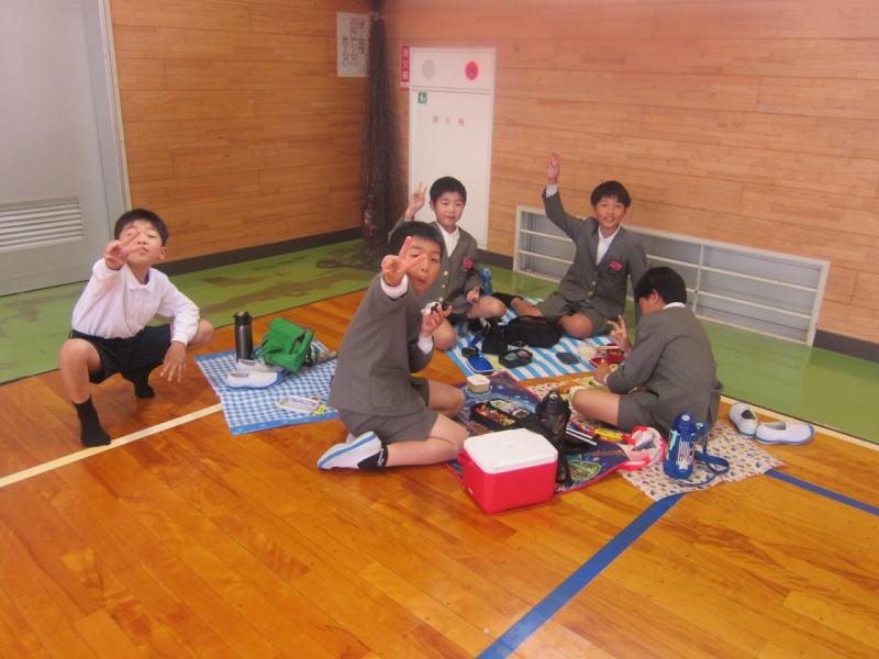 遠足はあいにくの雨。ということで今日は体育館に集まって敷物を敷いて体育館でお弁当を食べました。