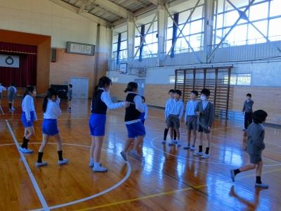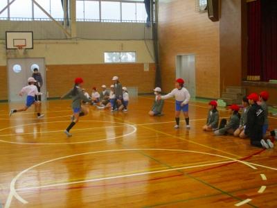 3学期は、縦割り班で体育館やプレイルームに集まり、8の字なわとびに挑戦しています。中学年・高学年の子が、回っている大縄に入るタイミングがつかめない下級生に、やさしく背中を押してあげたり、入るタイミングに合わせて声をかけたりする姿が見られます。入るのが上手な子の様子を見ることで上達する子もいるようです。