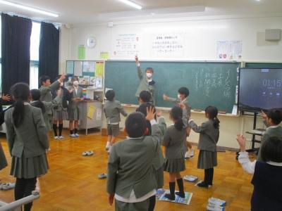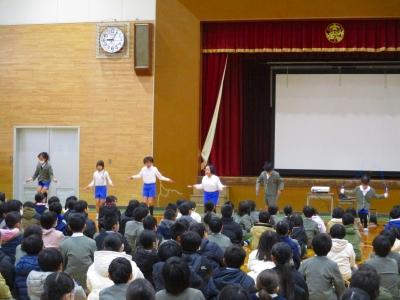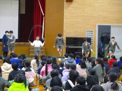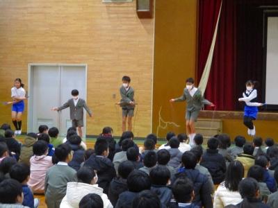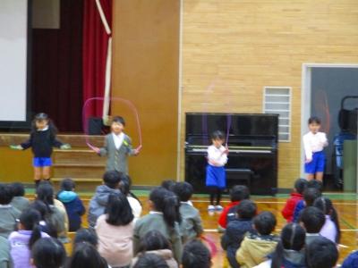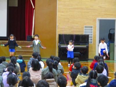 児童集会では12月、1月となわとび月間で頑張った児童の表彰と代表児童による模範演技がありました。見ていた児童たちからは技の難易度やきれいさに大きな歓声があがっていました。