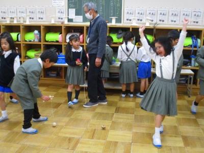 こま、けん玉、お手玉、めんこで遊びました。