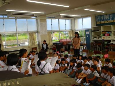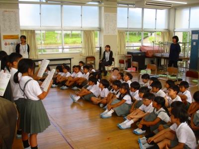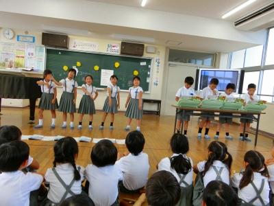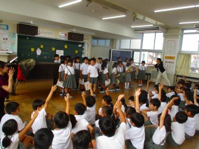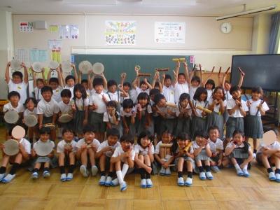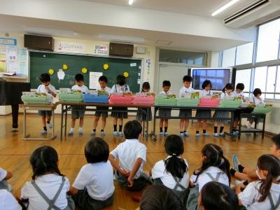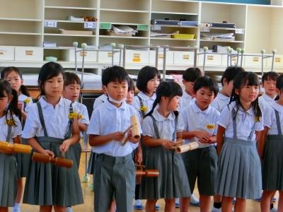 1学期の音楽の時間で習った歌を聞いてもらいたくて、コンサートを計画しました。お客さんは1年生、校長先生、担任の村瀬先生です。