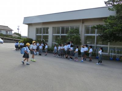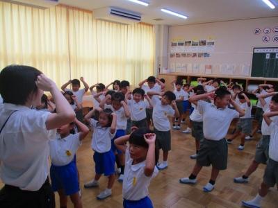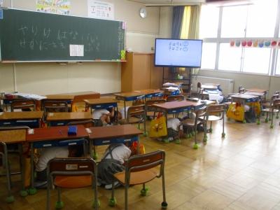 7月7日 9時より シェイクアウトいしかわ(地震の避難訓練)と地震による津波を想定した避難訓練を行いました。どの児童も、訓練用緊急地震速報が流れると先生の指示により「しゃがむ、かくれる、じっとする」の安全行動をとることができました。同時に、大津波がくることを想定した垂直避難訓練を行いました。