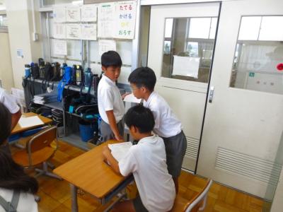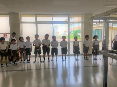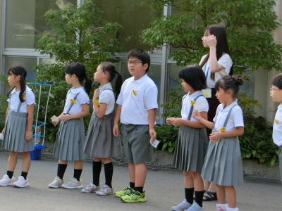 朝から蒸し暑い日でしたが、玄関の挨拶運動では、企画委員の子ども達だけでなく、他の学年からのボランティアの子もたくさん集まってくれました。プレールームが太陽を遮り、日陰を作ってくれるため、その陰の中で挨拶運動をする子ども達。朝から元気がわいてくるような挨拶が響いていました。