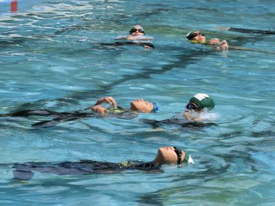 授業の後半には、実際に海難事故に遭ったときには、泳いで体力を消費するのではなく、じっと浮いて待つことが効果的であることから、服を着たまま水の中で浮く練習もしてみました。そのままでは、なかなか上手に浮けないのですが、空のペットボトルを胸に抱えてみると浮きやすいことも実感しました。