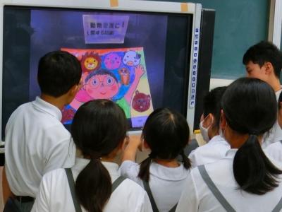 コンクールに出品してしまった作品は展示できないため、写真に残し、大型テレビでの鑑賞となっていますが、次々に現れる作品を見て「かわいい。」「すごい。」といいながら、熱心に鑑賞していました。