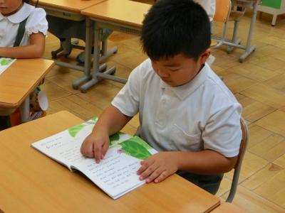範読を耳にしながら、教科書の文を一生懸命指で追いながら読む姿