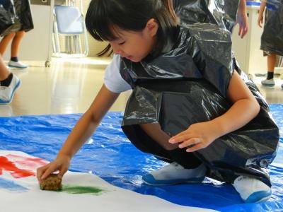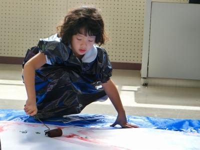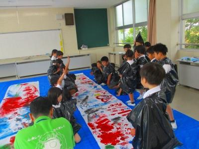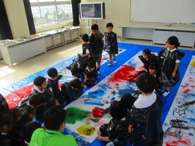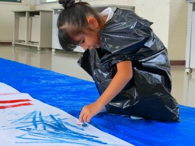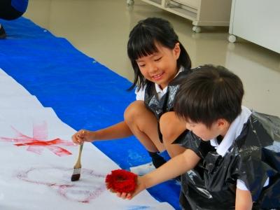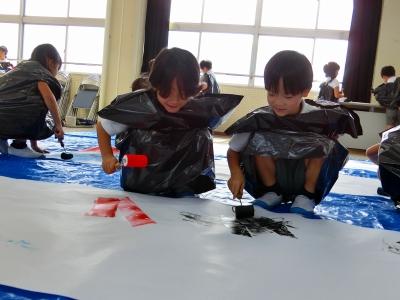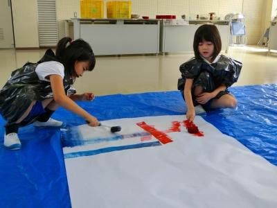 大きな障子紙にローラーや小物で思い思いに描きました。