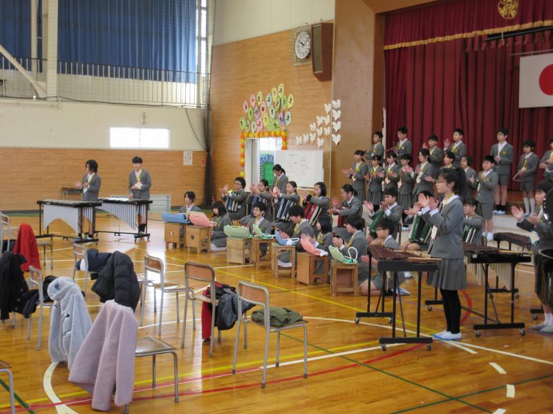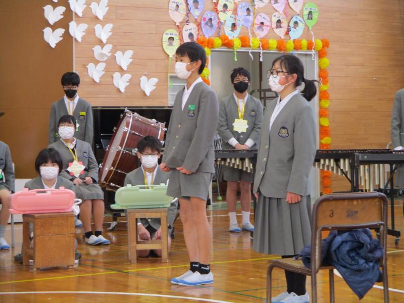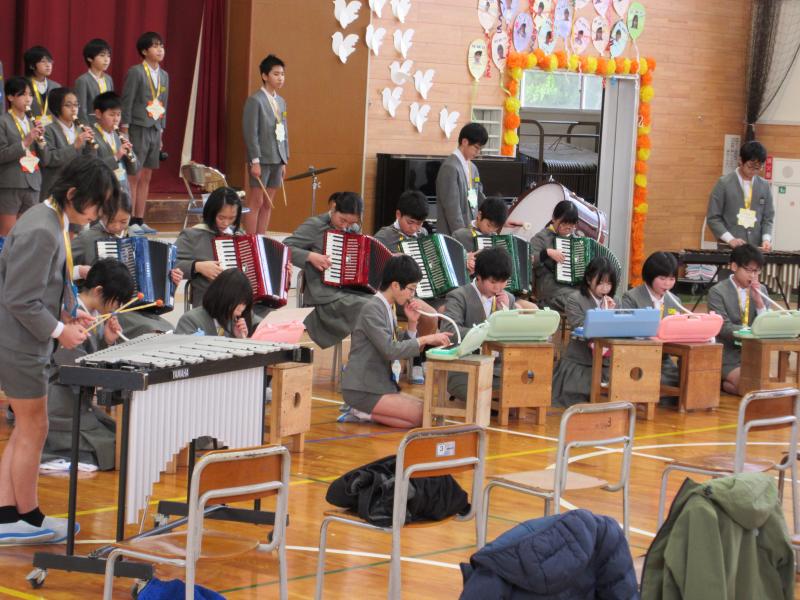 2年生は合奏と歌で6年生の思い出をふり返りつつ、感謝を伝えました。