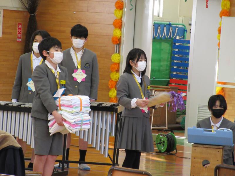 5年生は劇と合唱で6年生への感謝とエールを送りました。