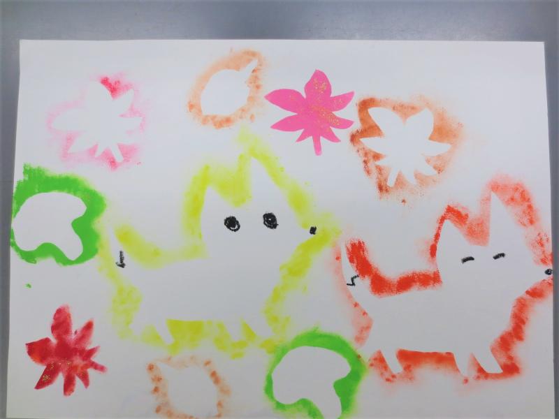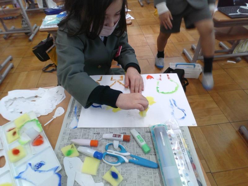 重ねて写したり、色を変えたり、写し方を工夫しながら、作品を作っていました。型紙で写した後、クレヨンで付け足しをしました。どの子も素敵な作品に仕上げることができました。