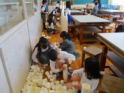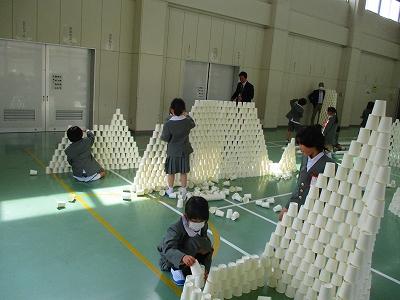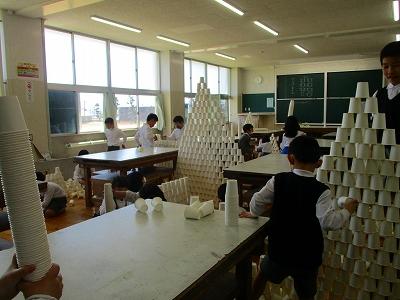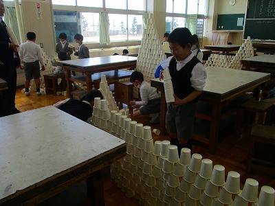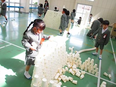 図工の授業開きでは、各々の好きなように紙コップを積み上げたり、重ねたりして楽しんでいました。