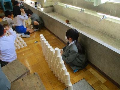 友だちと協力して紙コップをたくさん積み上げていました。