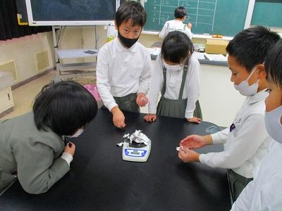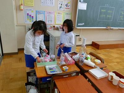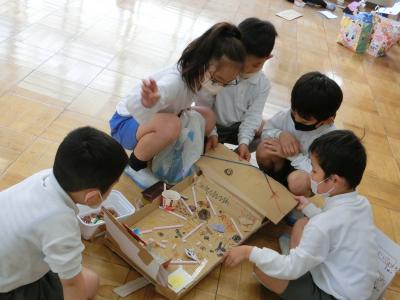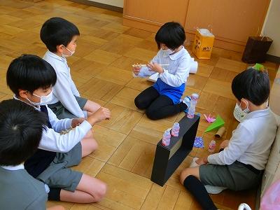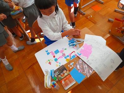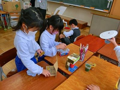 1年生は生活科で「見つけたあきであそんでみよう」「みんなであそぼう」の学習に取り組んできました。木の実や木の葉など、秋の自然物を使って遊ぶものや飾るもののなど、生活に役立つものなどを工夫してつくって秋を楽しむ学習です。