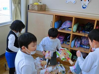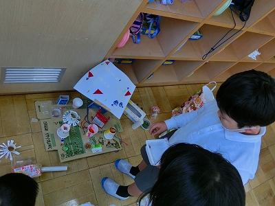 「おみやげ」「くじびき」「秋のレストラン」「アクセサリー」「たからさがし」「しゃてき」「どんぐりころがし」「まといれ」の8つのお店がありました。お客さんになる子、お客さんを集めるために宣伝する子、遊びに来てくれたお客さんの応対をする子などそれぞれの役割に分かれてとても楽しく学習することができました。