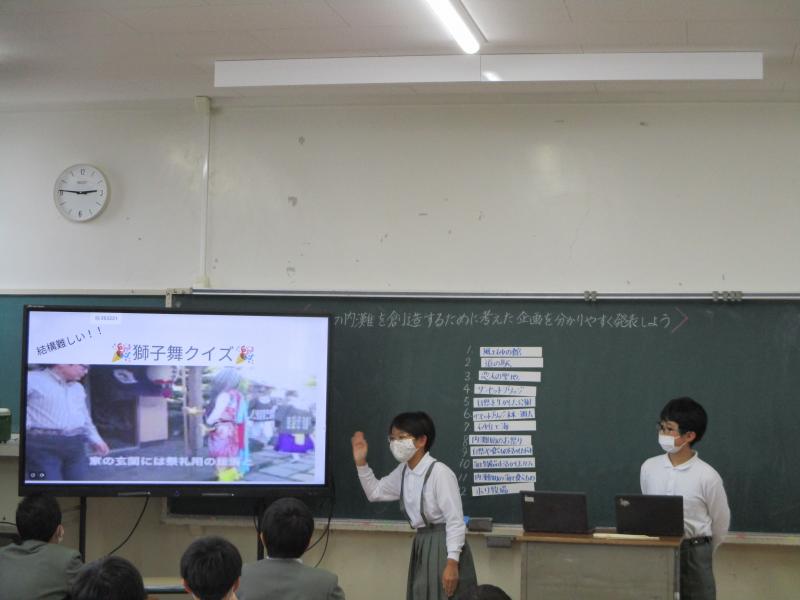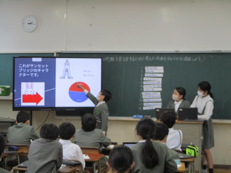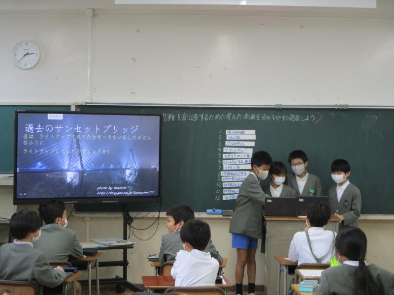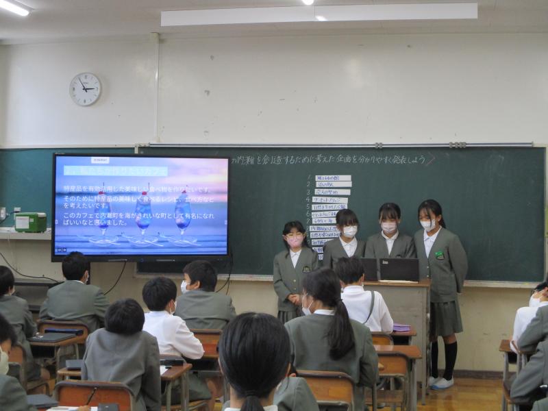 2学期の総合的な学習の時間に、内灘町の発展のために、内灘町の魅力を生かしたイベントや改善点から見直した解決策などを5年生の視点で考え、プレゼンテーションにしてまとめました。今日はその発表を行いました。
