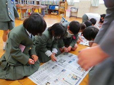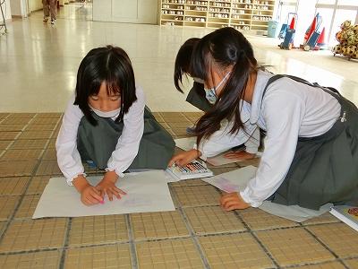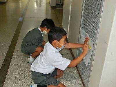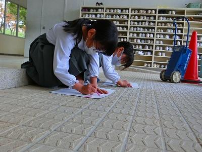 1年生が、色々なところでなにやら活動しています。近づいてみると、校舎内のでこぼこした部分を見つけて、紙にこすりだしています。図工科の「でこぼこ はっけん!」の学習でした。