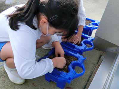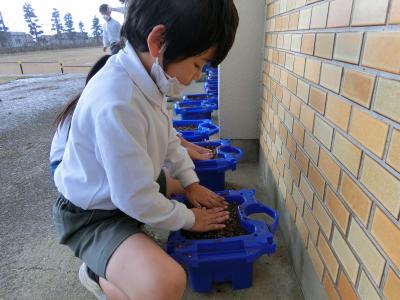 生活科の時間にあさがおを育てていた鉢を再利用して、チューリップの球根を植えました。春になると、それぞれの花が咲く予定です。