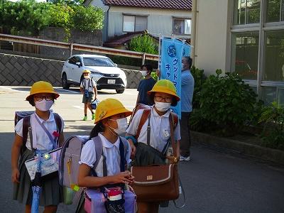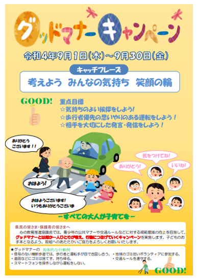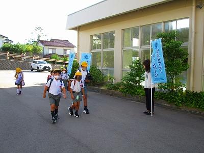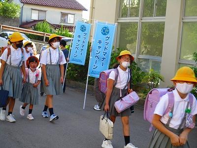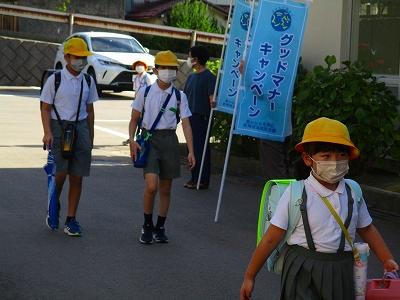 9月6日の朝、玄関には青いのぼり旗が・・・。「グッドマナーキャンペーン」と書かれた旗です。これは、石川県「心の教育推進協議会」が推進している活動でPTA活動の1つでもあります。一人一人がグッドマナーとは何かを考え行動に移していくことが目的です。