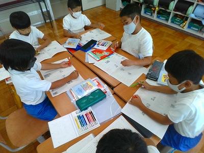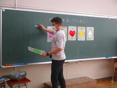 今日は、ケリン先生との楽しい外国語タイム。形の学習をしました。四角・丸・三角・星形・菱形などを英語で言うとどんな言葉になるのか、ケリン先生の英語を聞いたり、自分たちで発音したりしながら楽しく学習しました。ケリン先生の授業は、楽しくて子ども達はいつも興奮気味です。