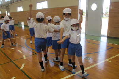 体育では、運動会の練習が始まっています。ダンスは2年生と一緒に演技する予定です。体育館練習では、2年生が1年生に上手に踊り方を教えてくれました。2年生の手本を見たり、演技のコツを教えてもらったりしながら少しずつふりつけを覚えていきます。