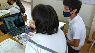 クロームブックでまとめたプレゼンテーションを活用して英語で上手に紹介しています。国の場所を地図上で確認したり、社会科資料集を使ってさらにくわしく説明したりと6年生の工夫がたくさんありました。