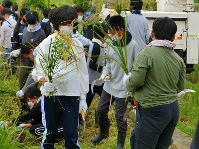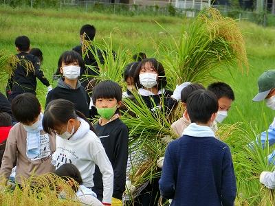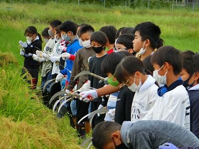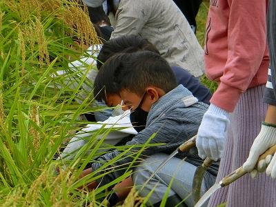 秋晴れの中、田んぼ名人の高道さんの指導の下、稲刈りを行いました。子ども達が稲刈りをしやすいように、高道さんが事前に畦の近くの稲をコンバインで刈って下さいました。目の前で大きなコンバインが動く様子を見学できて、子ども達には大きな学びになりました。また、実際に自分たちの手で鎌を使い、一束一束稲を刈ることで、手作業の大変さも学ぶことが出来ました。