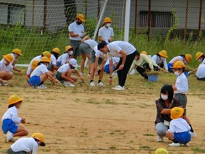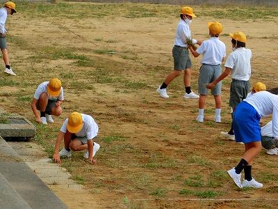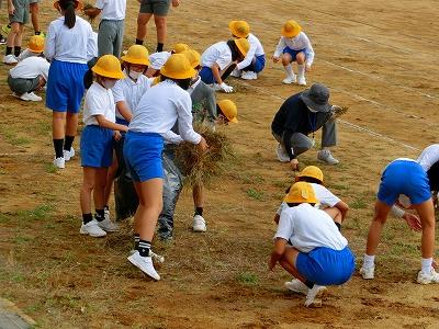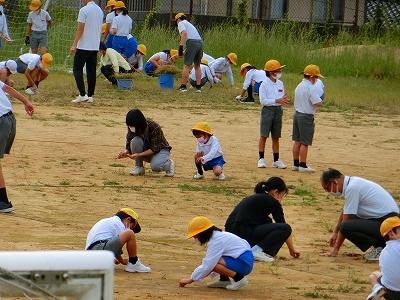 運動会にむけて、今朝は、朝から全校児童で運動場の草むしりを行いました。これまでは、職員が少しずつトラック周辺の草を取っていましたが、とても広い運動場なので、なかなかきれいになりません。自分たちが全力で頑張る運動会に向けて、一人一人が出来る範囲で除草をがんばってくれました。