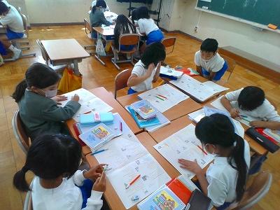 今日は、それぞれのクラスであらすじをまとめる学習をしました。全文シートに線を引きながら、がまくんとかえるくんの行動を確かめて、「①だれが②何をして③どうなったお話」と、あらすじをまとめることができました。