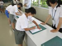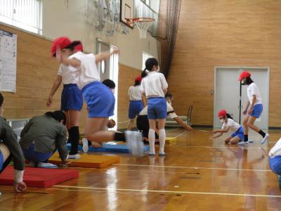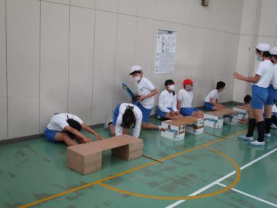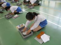 50m走や握力、シャトルランなどはそれぞれ体育の授業で行いますが、今日は、長座体前屈、ボール投げ、反復横跳び、立ち幅跳び、上体起こしを3つの会場にわけて行いました。