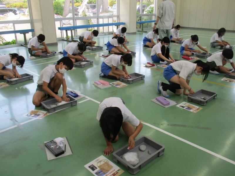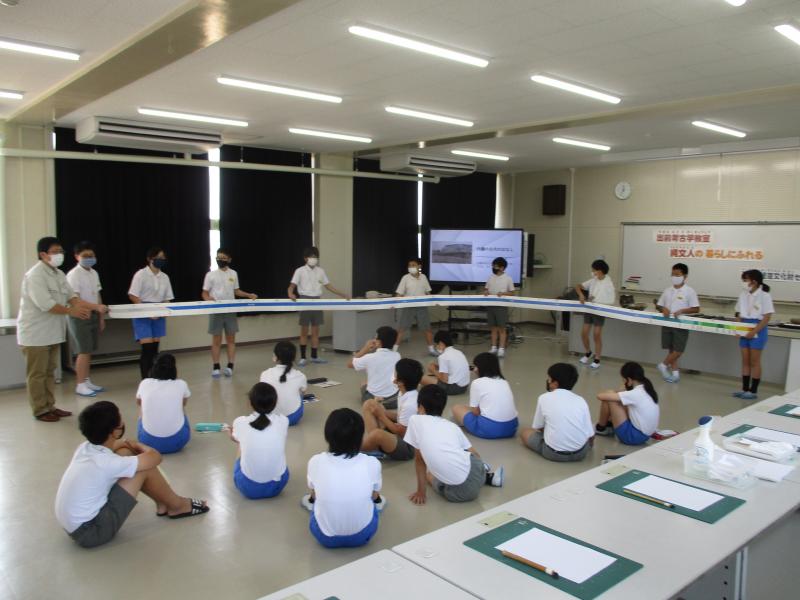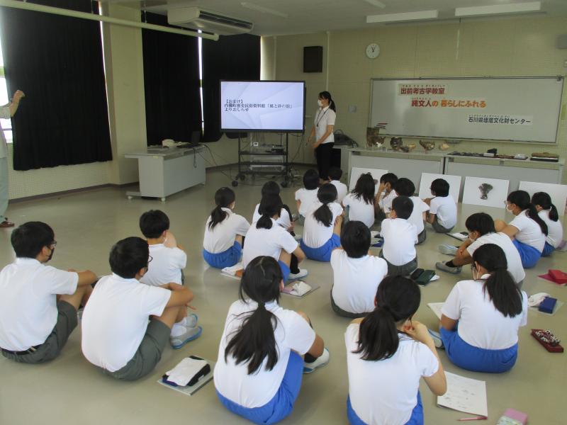 まいぶんセンター出前考古学教室で、縄文時代の歴史について、土器などの道具を見せてもらいながらお話を聞きました。
