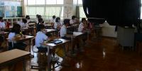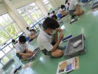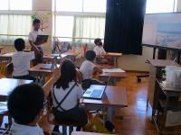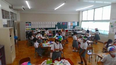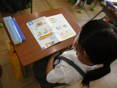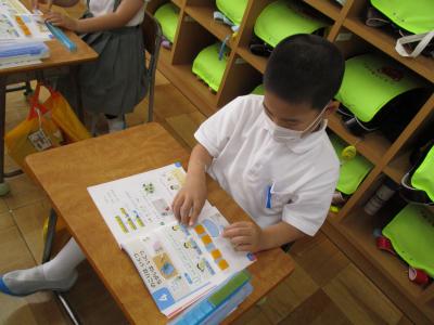 毎日暑い日が続きますが、子ども達は暑さに負けず学習に頑張っています。1年生は、算数でひきざんの学習がスタートしました。5匹の金魚が泳いでいる水槽から2匹の金魚を別の金魚鉢にうつすと水槽の中の残りの金魚は何匹になるかなという場面を使って学習しました。